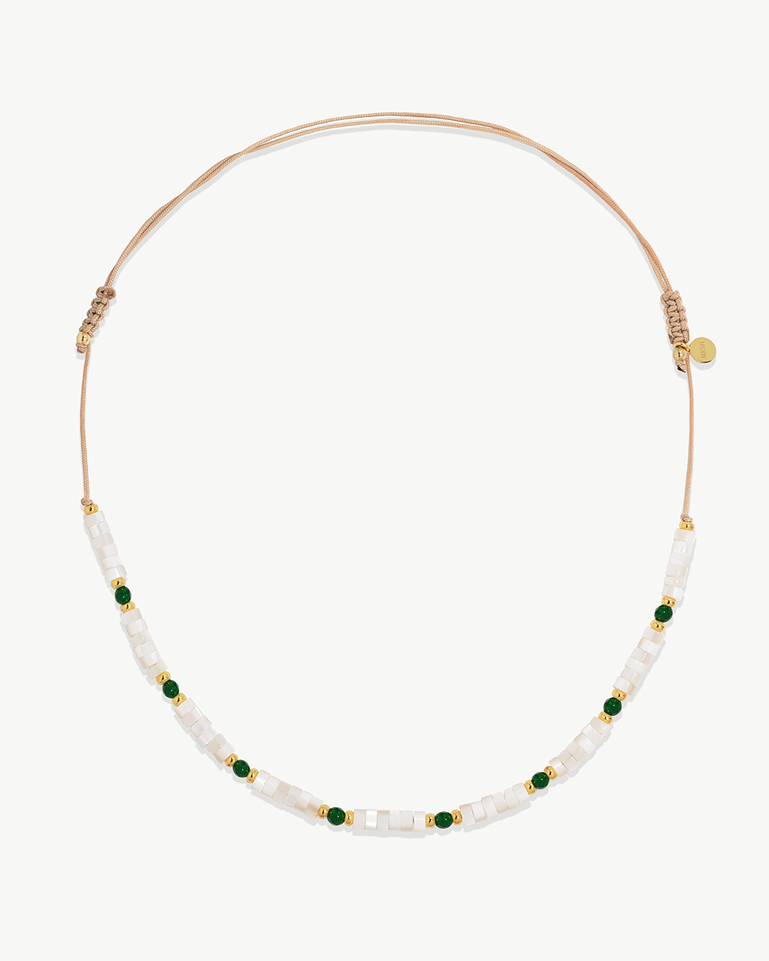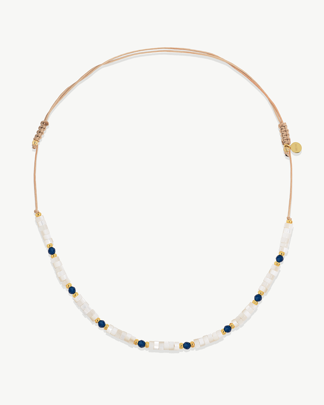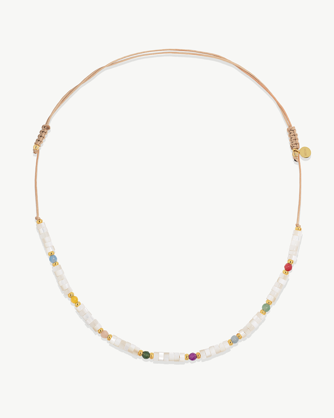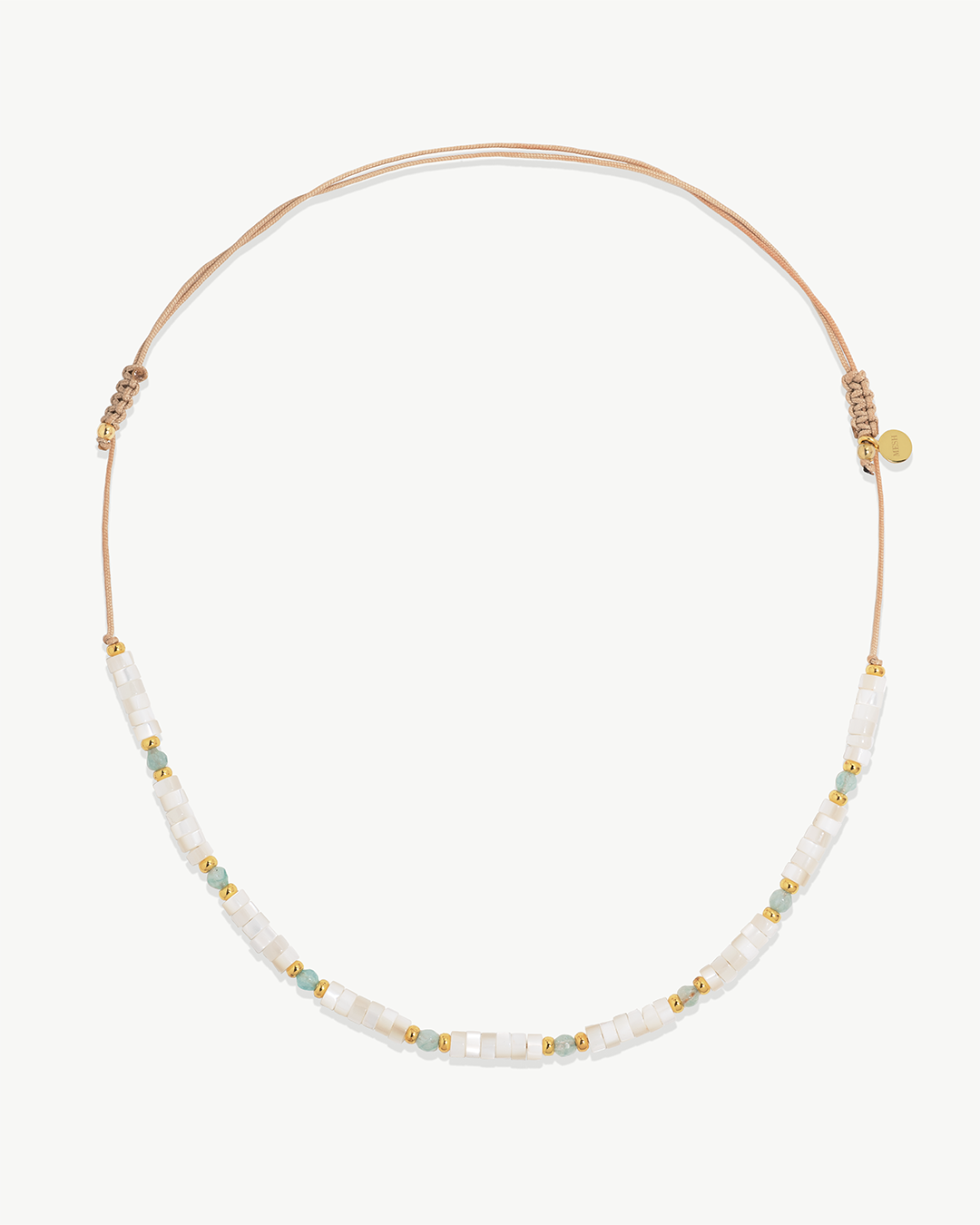 Colar ajustável em corda de algodão e fechos em macramé com pedras hidrotermais , madrepérola e prata 925 com banho de ouro.